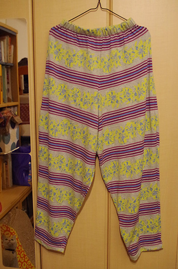 JUGEMテーマ:ニットソーイング♪ 短いキュロットスカートのパターンをながーく伸ばして、ダブダブのパンツを作りました。娘のリクエストだけど、布のチョイスがお気に召さない・・・で、部屋着になった・・・そうね、パジャマにピッタリだね・・・
