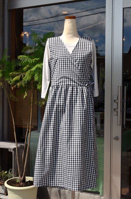 オーダーの作品です。 先染めギンガムチェック ブラック で、ノースリーブのカシュクールワンピース inにTシャツを着たり、カーディガンを合わせたりして重ね着が楽しめます。 前を開けてロングジレ風でもいいですね。 薄すぎず暑すぎずの程よい生地 ハリがあるのでキチンと感が出せます。 身頃部分は裏に綿ローンをあてました。 これで透けも気にならず、しっかりとした作りに...