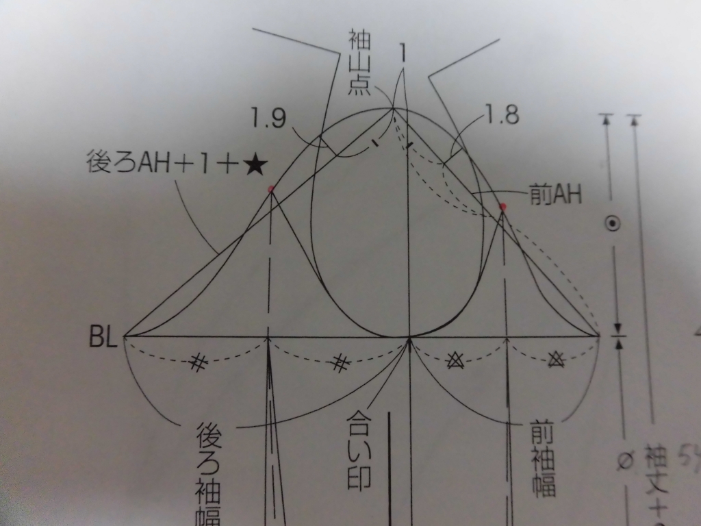 赤丸の点がどのように導き出されるかわかりません。横軸的には前後袖幅の1/2ですが、縦軸的にはどのように導き出されるのでしょうか。要確認です。 目分量で、袖山線から1?くらい上のところまで引いてみましたが・・・。 原型、スカート、シャツブラウス、ワンピースまでは、「文化ファッション大系テキスト」をみながら製図していくと、そんなに悩まずにできたのですが、ジャケットは謎多し!です。 JUGEMテーマ:洋裁・手芸