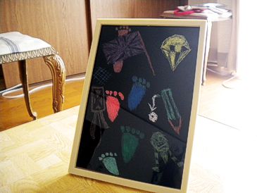 長男8才が絵塾で作りました。「ガラスエッチング」という名称が正しいかどうか分かりません。 片面に黒い塗料が塗ってあるガラスをエッチング用の針で引っかくと、線画だけが透けて見えます。 それを、裏側から、線画部分にだけ水彩絵の具を盛りつけます。 すると、幻想的で美しい絵が出来上がります。 こういう作品をつくるキットみたいなのがあるようです。 カラフルな足跡と右上の宝石が目を引きます。 ガラスの光沢と、色つきの線画のコントラストが楽しいです。 ステンドグラス風になるかと思い、裏から太陽...