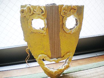 「アートアタック」という本に載っていた工作です。 休みの日にひとりで作りました。 ダンボールを土台に、新聞紙などを糊で固めて盛り付けて、金色に塗った仮面です。 ちょっと遺跡風でかっこいいですね。 「アートアタック」という本、 子供向けの美術工作の本としてとてもすばらしいと思うのですが、再販されないかなと思います。 JUGEMテーマ:子ども工作