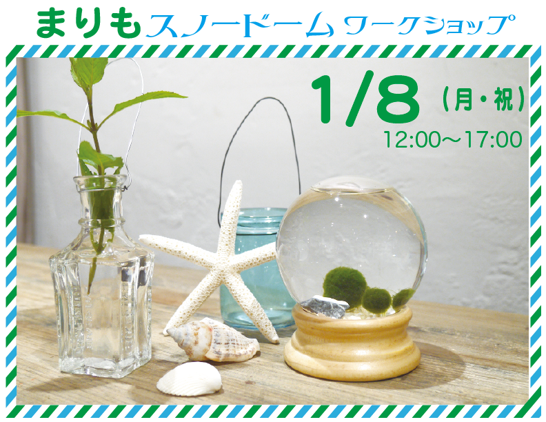 まりもスノードームワークショップ 北海道のお土産屋さんで見かける「まりも」 スノードームにしてお部屋で育てませんか 光合成をしながら1年で5mmほど、ちょっとずつ成長するまりもですが 室内のライトでも十分に育ちます! 1/8(月・祝) 12:00〜17:00 【要予約】 *開催時間内のどこでもご参加頂けます。 製作時間:30分程度 *材料確保のため、ご予約お願い致します。 参加費:¥4000 持ち物:エプロン・...