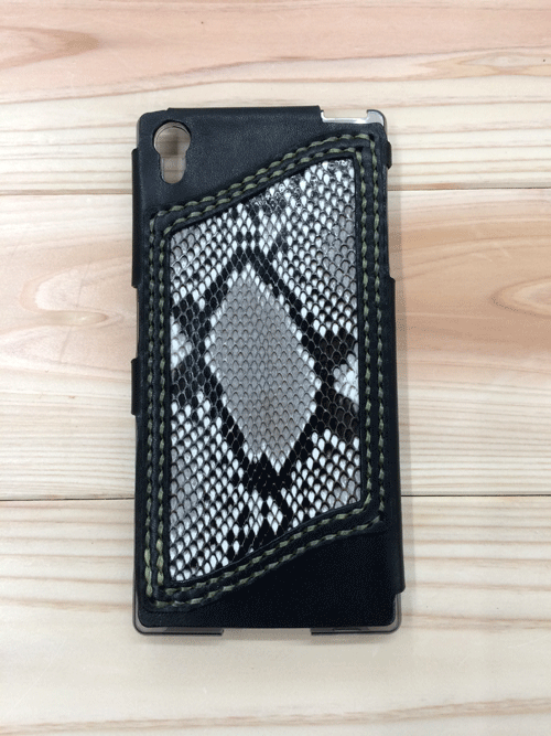 JUGEMテーマ:レザークラフト 今回製作したのはスマホケースですが、今まで製作したスマホを中に収納するようなケースではなく スマホに装着するケースに革を貼り付けた物です! デザインはお任せで、色は黒の革にダヤモンドパイソンを使用してほしいという注文でした。 以前に黒の革のインレイパイソン仕様の小銭入れを購入して頂いたのでお揃いにしたいとの事でした。 ケースに革をボンドで貼り付けるだけなのですが、サイズの調整等に割と時間がかかりま...