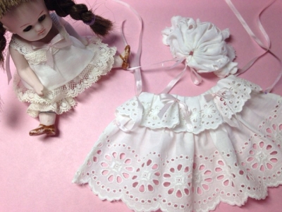 JUGEMテーマ:ドール服 13cmドールのコットンドレスが出来ました。 結局、予定してたレースと違うものを使いました。 後ろは2か所リボンで結ぶので、長袖のドレスの上に着せてエプロン風にしてもかわいいですね♪ このデザインは、以前タイニーブリュ(15cm)のサイズで作ったのと同じです。 気持ち小さいかな・・? レースも同じものです。 ボネットは違うレースを使いました。 後ろが絞ってあるので、よくわかりませんが・・ 撮影ができたら、16cm用と一緒に出品する予定です♪