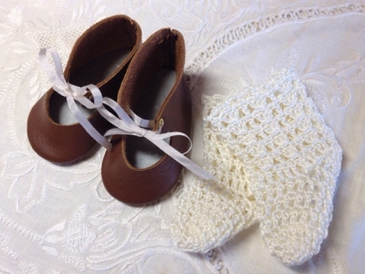 JUGEMテーマ:ドール服 コロンとした靴ができました♪ ビスクドールの靴は縁にステッチを施すけど、これはしませんでした。 ソックスも、20番糸で編んだのでざっくりした感じ。 このほうが男の子っぽいよね・・というのはおサボリの言い訳ですね・・あはは 裏はテリアです。 48cmのイネスと同じぐらいの足だったので、モデルになってもらいました。 市松さんは37cmなので、かなりの大足ってこと・・ でも小さくて履けないのも困るので、やや大き目にしたらまだ余裕があります。 よそのお人形の...
