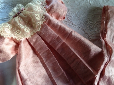 JUGEMテーマ:ドール服 シルクシャンタンは見た目がおもしろいので好きな布だけど、目が粗いので、横糸のほつれが多くて手間取ります(汗) 一応ジグザグミシンをかけますが・・ ヨーク部分だけ裏を付けることにしたので、早々に襟を付けて・・ ほつれを封じ込める作戦。 丈は短く見えますが、これにフリルを付けます。 最初考えてたボビンレースの幅が、ちょっと細いような気がするので、また考えなくては・・