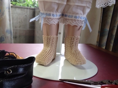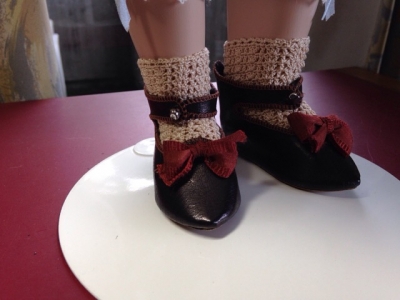 JUGEMテーマ:ドール服 編みかけてた40cm代の子用の靴下が片方あったので、履かせてみたらピッタリ。 そのまま両方仕上げて、セーラの靴下にしました。 セーラのアンヨをまじまじ見てみると・・ 大きくはないのだけど、厚みがあって、ジャーマンのように甲の高い足・・ 身長が同じぐらいの子が履いてる靴が入りません。 ひとまわり大きな靴、これは入りました。 この靴はフランスの古物です。 足首のベルトの無いクラッシックなデザインで、バックルがマザーオブパールの細い細工です。 シンプルだけ...