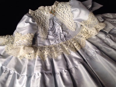 JUGEMテーマ:ドール服 ドレスが出来ました。 グレーに写りますが、薄〜いブルーです。 空色というより水色・・ とてもはかなげな色なので、こってりしたレースが似合いませんでした。 細い細い糸で編まれたボビンレース・・ 解体したレースの真ん中を襟に付けて、長いほうのレースにギャザーを寄せてウェストに。 残ったレースを袖口に・・これで上部の細いレースを除いてすべて使いました。 こうなると、スッキリ♪ アンティークレースは途中で切ったり、残ったりすると、なんとなくスッキリしない・・ ...