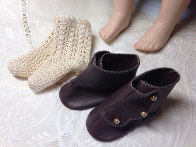 JUGEMテーマ:ドール服 アンティークドールの本に載ってた、ブリュブーツの型紙で作ったのだけど、サイズが微妙に大きかったかな・・? 先が丸いデザインだから、余計に大きく見える。 底を2mmほど伸ばしただけなのに・・靴のフィッティングって難しいなあ・・ その分靴下を厚くしようと思い、20番糸と0号針で編みました。 すごく早く編めた♪ 靴のステッチも大雑把過ぎ?(苦笑) もしかしたら大きい子には、これのほうがいいかもしれないな・・ 記念撮影♪ 着せてみると、意外とドレープはうまく出...