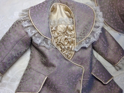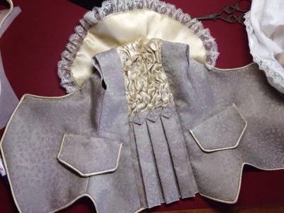 JUGEMテーマ:ドール服 ジャケットはほぼできましたが、飾りボタンを付けてから裏を綴じようと思います。 途中まで綴じてあります。 ボネットの土台が出来ました。 ネットレースが涼しげで、思ってたより素敵♪ これから布花やアンティークリボンで飾ります。 一番楽しい作業♪ 後ろにもシャーリングがあってかわいいです♪ この型紙は辻容子先生の写真集に載っていたものを使いました。 本のモデルはFB16Sボディのブリュでしたが、この前合わせのデザインはブリュの代表的なものですよね。 ...