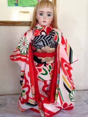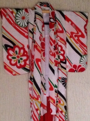 JUGEMテーマ:ドール服 袖も付けてないし、裾のふきも作ってないので、まだ全然できてないのだけど・・ これも知り合いからいただいたもの。 お子さんの晴れ着だったそうですが、はっきりした柄が子供らしくてかわいいなあと思うけど、市松さんにはちょっと派手だよね〜 でも大きなリプロにはいいかな?と思い、62cm用で作っています。 ピン留めして、三尺を結んでみました。 どうでしょうね・・?