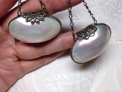 JUGEMテーマ:ドール服 ドール用のシェルパース、今回は中にものを入れられるようにしました♪ シルクローンを貼って、縁に6mmぐらいのアンティークレースを貼りました。 小さいカメオも付けて・・ 留め金を蝶番で付けたので、開閉も可能です♪ でも、底の蝶番と鎖のまるかんの厚みの分で、どうしても隙間が空いてしまいます・・ 次回は改良して作りましょう〜♪ 最初はハンダ付けでやろうとしたのですが、失敗! お人形友達が、ステンドグラスの技法でアンティーク風シェルパースを素敵に作ってらした...
