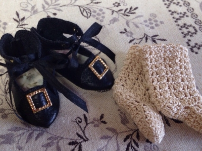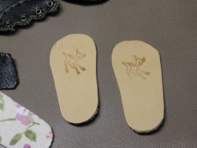 JUGEMテーマ:ドール服 先週はあまり時間がなくて全然進んでないけど・・ FB10ボディのブリュに合うよう靴を2足作りました。 レースアップブーツと、ビスクドール靴 まだ仕上げがしていないので、バックルは乗せてあるだけ・・ バックルが四角いと魔法使いみたいでかわいい♪ 刻印はアンティークっぽく、ゆりの紋章。 今度はきれいに押せた♪ コバコート仕上げもしますよ。 もうひとつビスクドール型をカットしてあるので、どちらかを出品する予定です。 リボンを通すためのハトメは、ブーツのほうは2...