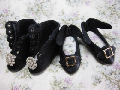 JUGEMテーマ:ドール服 のんびりしてたので遅くなりましたが、2セット作りました。 レースアップブーツ ビスクドールシューズ 明日きちんと写真を撮って出品予定です。 別に身長60cm用の大きな靴用の革を削っているときに、ズバっとやっちゃいまして・・(ショック!!) ここは見えないところだけど、縫い縮めて引っ張る部分なので、ちょっときびしい・・ おうち用かな・・ 牛革ですが、柔らかすぎて扱いにくい革でした〜 今日チョコブラウンの羊革が届いたので、そちらでリベンジします♪ ...
