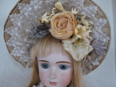 JUGEMテーマ:ドール服 ボネットも、だいたいできました。 淡い色の大きなお花が活きました♪ この方のお花は本当に上品な色あいで、大好きです。 最近見かけないので、残念・・ 後ろはドレスと同じ刺繍の花柄なので、リボンと羽根を付ける予定ですが、用意していた羽根が小さかったので、大きな羽を注文して待っているところ・・ そうそう、例のアンティークレースですが・・ 結局スカートには付けずに、ボネットだけにしました。 スカートに付けてみたら、なんとなく野暮ったい感じだったので、はずしてし...