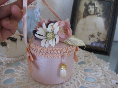 JUGEMテーマ:ドール服 昨日こんなものを作りました。 バニティバッグです。 前に作ったものよりかなり大きく、大きなお人形向けです。 バニティバッグは本来ならお化粧道具を入れるものですが、形がかわいらしいので、これをバッグにしているかたも多いですよね♪ 私もこの形は大好き・・ シルクシャンタンで、タッセルの代わりにビーズを付けてゴージャスな感じにしました。 うち蓋にデコパージュしてあります。 持ち手のひもと、ブレードはピーチピンクで、どちらもアンティークの材料です。 こんな風に...