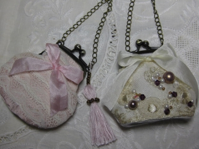 JUGEMテーマ:ドール服 次はミニョネットのドレスにかかろうと思いつつ・・ 土日、大きなイベントがあり昼間はずっと出かけてて、なかなか手に付かなかったので、こんな小さなものを作っていました。 小さながまぐちバッグです。 どちらも同じ型紙だけど、白い方は底をへこませてあります。 まだ試作中・・ 白い方が結構気に入ってます♪ アンティークレースを付けて、その上にストックしてあったビーズを縫い留めました。 このレースはシルクの刺繍がしてある素敵なものですが、長さが30cmもないので、使...