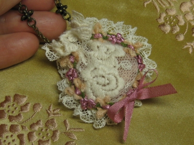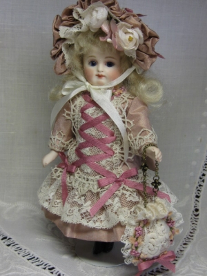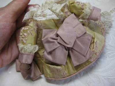 JUGEMテーマ:ドール服 小さなレースのバッグを作りました。 このフラワーテープがとっても貴重なものなので、中途半端に残ったのがもったいなくて・・ (長いほうはまだあるのですが・・) ぴったり納まると気分もいいです♪ 持ち手のチェーンも小さなパーツを組み合わせて、少し個性を出しました。 この生地はGildebrief(ドイツの有名なビスクドール雑誌)に掲載されてたミニョネットのドレス生地で、ヤフオクにたまたま出ていたので、落札したものです。 刺繍もシルク糸で、とても素敵なのですが・・ ...