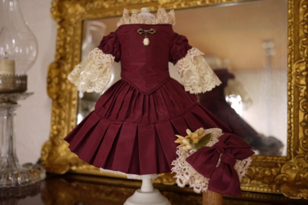 JUGEMテーマ:ドール服 33cmアンティークジェスランボディのゴーチェさん ツーピースドレスとお帽子 裾から少しペチコートが覗きます。 胸元はピンクの極小カメオ・・ワインカラーに合わせると可愛いです♪ お帽子は、プロムナードボネット風ヘッドドレス 大塚先生のブルブテが被っていたお帽子がとてもかわいらしかったので、参考にさせていただきました。 後ろ...