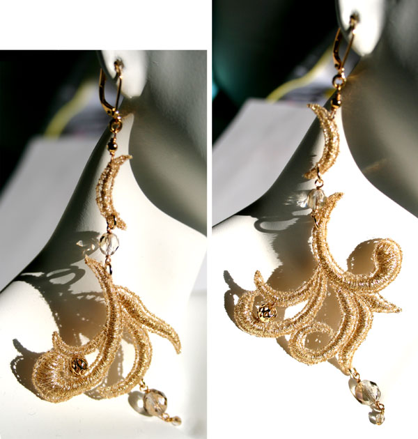 レース好きです。 唐突に(笑) で、こんなステキなレースを見つけて、 ピアスにしてみました。 実はコレ、「完全完成形」、というか。 このブログに載せてる、 イベント用に作った紹介画像の上の方に、 載ってるんですが。 当初のデザインは、↓でした。 まだコレ、レジン塗る前なんですね。 で、レジン塗って、色々もたぐってるうちに、 ↓の完成形になりました。という。 初めてマネキンさんに着用させた時、 息子に「…スッゲー楽しんでるでしょ」と、ニヤニ...
