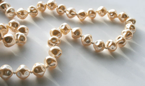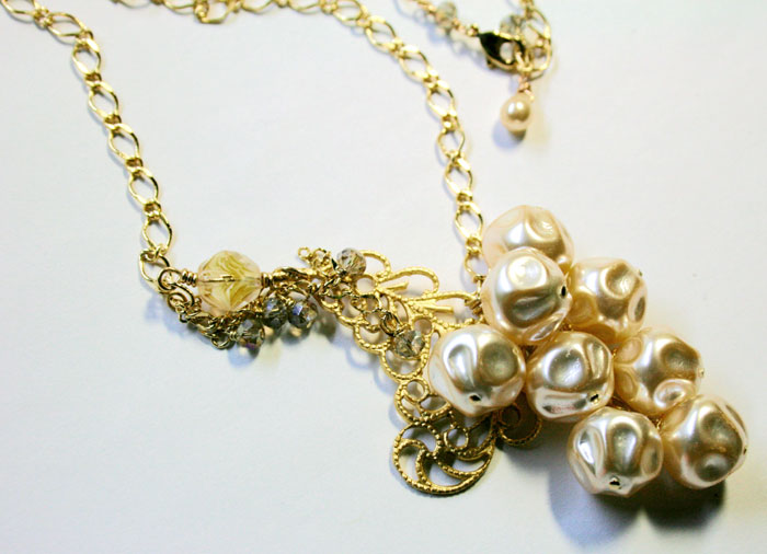 2個前にアップしているバロックパールです。 まだロングネックレスは解いてないんですが、 残りのパールで、ネックレスを作りました。 最初はもっと、ごくごくシンプルな、 どこにでもありそうなリボンネックレスを作るつもりでした。 ちょっと気が向いて、レースフィリグリーを並べたら、 なんかゴージャスなお品に仕上がりました。 マーブルのチェコビーズに、ABガラスビーズ。 このガラスビーズのとこ、すごく悩みました。 色々試して、最終的にこうなりました。 同じフィガロのサイズ違いのチェーンを、...