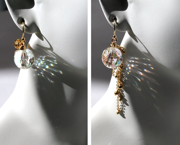 おひさまの光でこんななってます。 以前試作していたミラーボールピアスです。完成。 写真では、右と左でプラビーズの色が違うように見えますが 同じビーズです。AB加工の色の位置でしょうか。 すっごいな本当にミラーボールだ。 …派手好きじゃありませんよ。私決して派手好きでは。 たまたまです。たまたま。 たまたま買ったビーズを使ったらこうなっただけです。 …ほんとだよ!(笑///;)