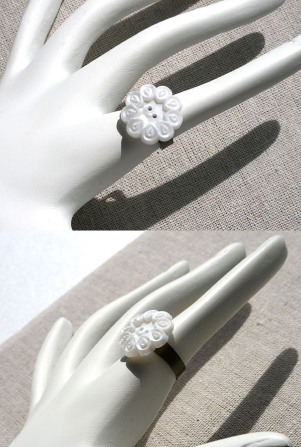 本日アップしました、 ヴィンテージボタン・パールフラワーのリングですv こちら、ボタン素材そのものがパールカラーなのです。 ふんわり優しいホワイトパールに、 これまた可愛いふわふわのお花のカタチで、 ショップさんで見掛けて即買いでしたv 購入したのはすんごい前で、 そちらのショップさんではもうお取り扱いが無いのですが 先日、別のショップさんでこのボタン、...