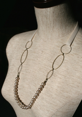 いやもう、しつこいですけど、 何度も何度も同じこと言ってますけど、 写真が…!! 質感がね、上手に出したい、 このヴィンテージパールのね、ヴィンテージ感をね、 なんとか損なわずに、まっすぐに、 お伝えしたいんですが…! こういう、リボンネックレスを作ったんですね。 で、肝心のパールの、質感。 明るすぎると、飛ぶ。 暗すぎると、重い。 なんていうか、テリはあんまり無いガラスパールなんです。 ちょっとマットな感じで。それが良いのに、 のに… うう&...