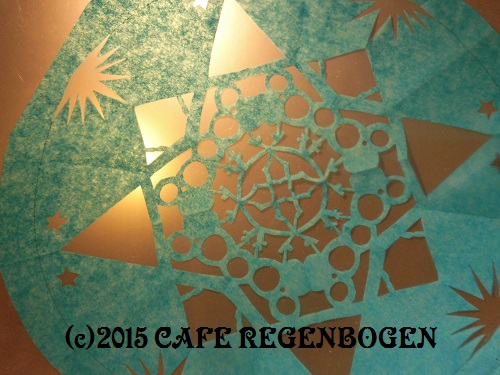 星の影 カットしたローズウィンドウ用紙の3枚目は貼らず、2枚で我慢。橙色と水色、そこが重なってできる茶色が好きです。ふと気づいて並んでいるローズウィンドウを見ると、同じような色ばかりになってしまっています。そうなると好きな色なのに詰まらなくなるので、そんな時には普段使わない濃いグリーンなどを取り入れてみます。 JUGEMテーマ:ローズウィンドウ