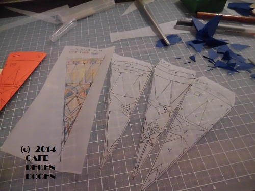 今回は私が作る手順の様子を簡単にご紹介します。 1)デザイン(図案)を描いて、型紙を起こす。 私の場合は、デザインを固めるまでが長いのですが、とりあえず、考えて色を塗る。はさみで作ることができて、かつ簡単すぎないようなもの。ローズウィンドウ作りは初めて〜慣れていないけど作ってみたいという方向けの、試作品です。一度すべて完成させてから、また変更して、作り直します。 2)16分割用に紙を折った上に、カーボン紙で写す。 今回選んだ色は、ブルー(こちらは残念ながら廃版!ぜひ復活してほし...