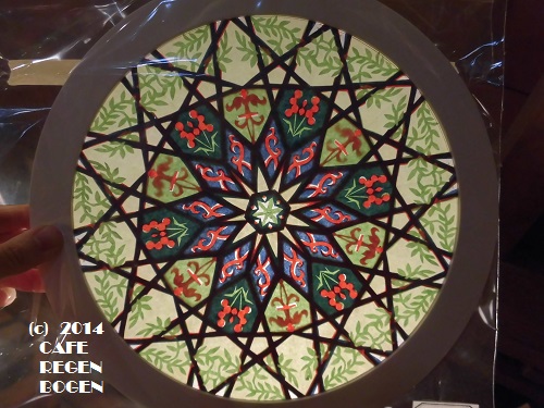 カフェカウンターの前にはローズウィンドウを並べています。作品例は手に取って見て頂けるのと、ローズウィンドウの材料を買いに来た方と色々お話できるのが楽しい時間です。並べているのは窓の傍ではありませんが、光が差し込む場所だと店内(室内)でもとても綺麗に見えます。撮影は多分夏時期。左の二つはアイヌ文様の図案です。 奥にはブライトシュベルツ社・太陽と星のモビール。こちらはキンダーリープでは非売品で、なかなか珍しいそうです。 JUGEMテーマ:ローズウィンドウ