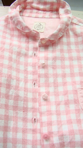 JUGEMテーマ:ナチュラルな服と雑貨 ボタンを全部変えて ピンクのリネンギンガムでシャツを作った。 襟とポッケはちっちゃくして・・・ 袖は七分丈で、スリット入りに。 着丈はやや短めにしてみた。 ギンガムチェックのシャツ・・・ ちょっと間違うとパジャマになっちゃうんだ。 これは大丈夫かな? 笑
