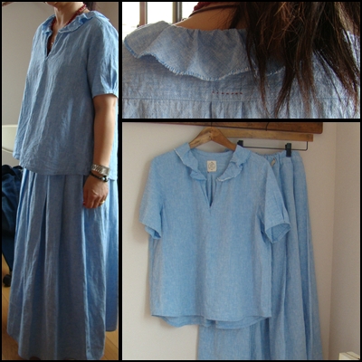 JUGEMテーマ:ナチュラルな服と雑貨 夏にぴったりの爽やかな水色の綿麻シャンブレー。 切りっぱなしのフリフリ襟がポイントの半そでブラウスと タックをたっぷり入れたロングスカートを作った。 なんだか清楚。 笑顔が似合うママって感じ? 「子どもを怒鳴れないわね♪」 「ごきげんよう〜ってあいさつしなきゃ」