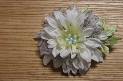 清楚な雰囲気の白いダリアのコサージュを作ってみました。 結構大ぶりなので、色は控え目、爽やか・清楚な感じにしたくて ”グリーンのシュガーパール”を中心に縫いつけてみました。 カメラでアップの写真を撮ってみたら、本物の花のようで、 この組み合わせが気に入ってます♪ 黒っぽい生地の上に置いたらこんな感じ 自然な花風の大人目なダリアのコサージュになりましたが 下に連パールのビーズを下げたら、もっとフォーマルになるかな、どうかなと もう少し手を加えようか...