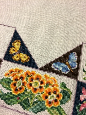 JUGEMテーマ:クロスステッチ♪ お花のクロスステッチ、進めています。 今回は真ん中あたりのちょうちょの部分。 ちょうちょの背景の色を変えてあります。 全体像はこんな。 次は左上のコマを刺します。 Sandy Orton "Nature's Wisdom" DMC 32ct リネン