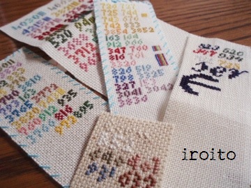 オリジナルで作品のデザインをするようになってから色を決める時に試し刺しをしています。刺繍する布によって同じ色でも出方も違うし、一緒に使う色とのバランスを見るために使う布に色番号を刺してます。あとで使う時にもその色番号で確認もできるので並べて刺した時のバランス見たりバックステッチや 1over1 の場合と 2over2 のパターン白は特に難しい布と一緒にしまってます。JUGEMテーマ:クロスステッチ♪でも色見本帳はあこがれます