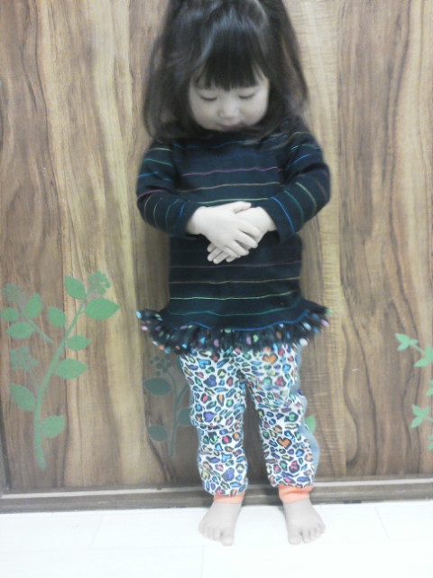 てづくりCAFEさんのラウンドネック女子T-普通袖を作りました。 モニターとしてだったので、着画をきちんと撮りたいのですが…、 ジッとしていてくれたのは、これ一枚。 ズボンは同じくてづくりCAFEさんのぴったりリブパンツ。 袖丈は今回は型紙通りに作りました、長さぴったり♪ アレンジでフリルの型紙が入っているのですが、 ちょっとキルトスペシャルの調子が悪いので、チュール付の市販レース。 分かりにくい後ろ姿ですが、背中も出ないので良い感じです。 やっぱり2段フリルならワンピ感覚になるかな。 今...