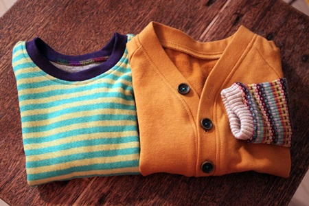 JUGEMテーマ:子育てしながら HANDMADE♪ パターン mahoe anela 布花茶家 出産祝いのオーダーいただきました。 と言っても、父からなんですがね。 身内のってオーダーって言うのかしら?まあいいか… ボーダーのTシャツは、 とっても肌触りのいい接結ニットを使いました。 接結のわりにテンション高めで若干扱いにくい生地でしたが、 カバステと最近仲良しなのでね。 やっぱり使ってやらなきゃいかんですね。 カーディガンはいつもの(笑) うちの子たちにも作ってやら...