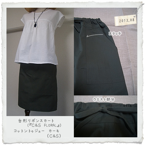 JUGEMテーマ:子育てしながら HANDMADE♪ C&Sさんの本「C&S FLORAL」から台形リボンスカートを作りました。ウエスト部分にゴムが2本入るのですが、ゴムをきらしていて、まだ入れていません。が、ひもがあるのでこのままでもはけなくはない感じ。生地は、C&Sさんのコットントゥージュ カーキ。生地の厚さもほどよく、しっかりくせがつくので、作りやすかったです。ポケットやセンターに2本のステッチが入っているのですが、糸を同色にしたため、画像ではわかりずらいですね。。。丈を膝が少し隠れるくらいの長さに変更...