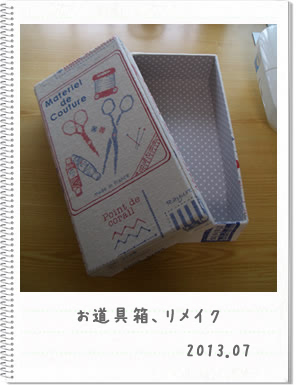 JUGEMテーマ:子育てしながら HANDMADE♪娘が小学校で使っているお道具箱、夏休みなので家に持って帰っていたのですが、さすがに6年も使うとボロボロ・・・(リメイク前の写真撮っておけばよかった・・・)でも布を張ったら、かわいく生まれ変わりました。おまけ