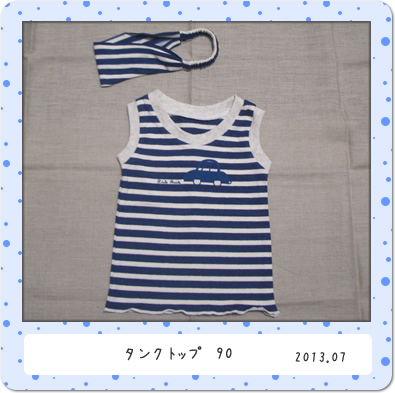 JUGEMテーマ:子育てしながら HANDMADE♪ 息子のタンクトップ。この前作った娘のタンクトップと同じ生地です。パターンは、クライ・ムキのlalala3から。残った端切れでヘアバンドも作れました。余すところなく使えて、気持もスッキリ。もう一つは、AラインTシャツをアレンジ。サイズ的に、150〜160くらいになっています。裾がAラインになっているところがかわいいのだけど、かなり生地使います・・・。袖の分がとれなかったので、襟と袖に、レースニット メヌエット(SMILE)を使いました。