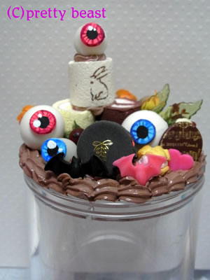 JUGEMテーマ:☆スイーツデコ☆ のぁぁぁ〜! 明日、明後日はついにデザインフェスタ本番です! 何故か去年以上に進まなかったけど、なんとか持ってく作品出来ました。 とりあえずの〜…ですが、夜、時間できたら他のもアップしますね。 今回の目玉! 自分でお気に入りの「ホラー好きさんのための目玉小物入れ」 光彩ちまちま描きました。 アクリルのポットなので、コットンだったり、綿棒だったり、おやつだったり入れられます。 「ふわふわカップケーキの小物入れ」 …なんだけど主役がすっぽ...