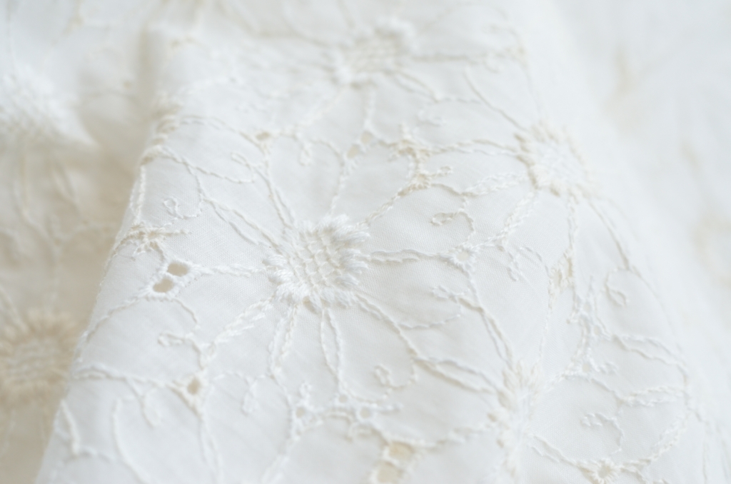 とっても上品な綿レースが届きました♪ 白地にひまわりのような大きめのお花の刺繍 白や薄いベージュで丁寧に施されています。 耳の部分も丁寧に始末されているので、クロスやインテリアにもおすすめ 綿100% 98cm幅 日本製 ¥2,900/m+税 ショップページはコチラ そのほか、レース...
