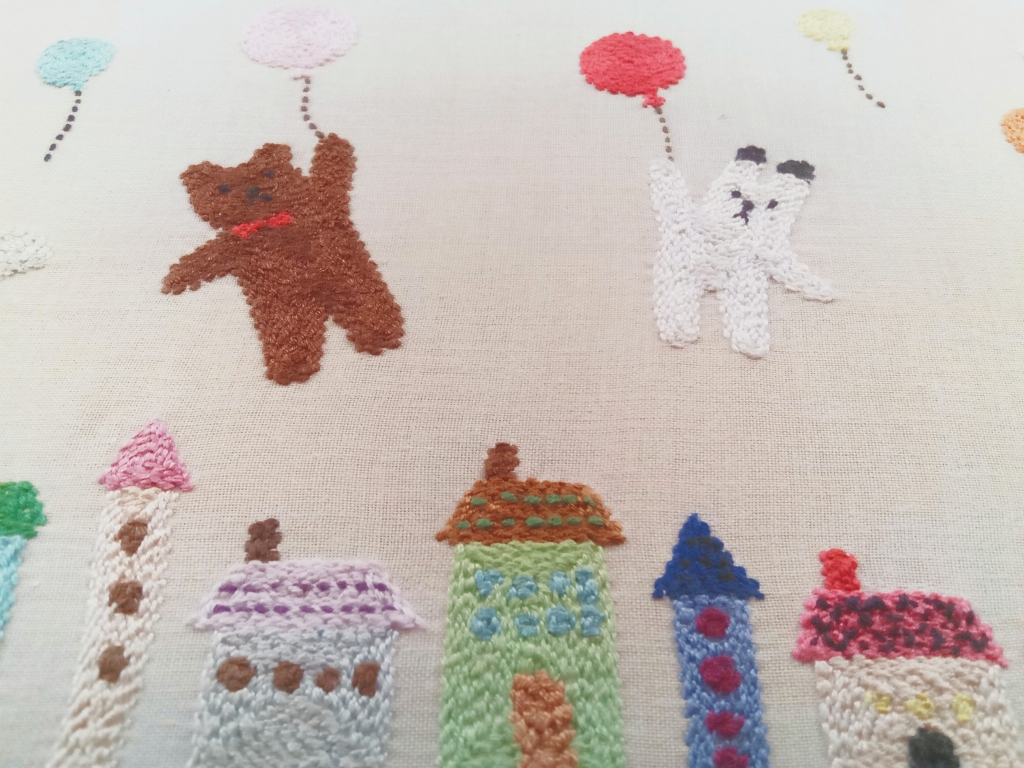 ふわふわ ふわふわ 気持ち良さそうに空に浮び上がる クマとウサギ ぬいぐるみの様な刺し子たち ちいさなゾウもいます いろいろな家が可愛く並んでます りなさんが刺繍をした、作品です。 今年の11月に予定している、コルメナ作品展で展示します。 パネル張りをすれば作品らしくなりますね。 他にもこのような素敵な作品がたくさん出来上がっています。