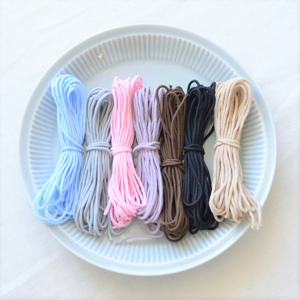 とっても可愛い色合いのマスクゴムが入荷しました!! やっとマスク資材も供給が安定してきて、より手作りを楽しめるようになりましたね(^-^) 色は・・・水色、グレー、ピンク、パープル、茶色、黒、ベージュの7色 伸びの良い丸ゴムで、とても肌触りの良いお品です。 生地に合わせて、カラフルに楽しんでみてくださいね!! 5mカット済...
