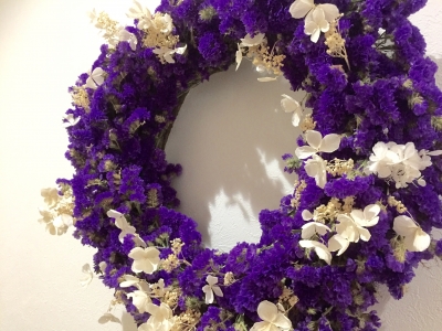3月の終わり、原村の道沿いの生産農家さんが捨てていたスターチスを、許可を得ていっぱいもらってきてドライフラワーにしていました。 このまま花瓶に挿したままでもいいけれど、リースにするのもいいかな、こんなにたくさんあれば大きなのができる! 私が持ってるリース台はせいぜい20cm。そこで友人に頼んでツルをクルッと巻いた大きなリース台を作ってもらいました。 かなりぎっしり分厚く巻いてスターチスは使い切り、直径50cm近くのリースの出来上がり! でも紫色ばかりではなんとなく物足らないので、ピラミッドアジ...