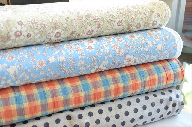 お待たせしました。 ダブルガーゼが届きました。 ■ダブルガーゼ フラワー (ベージュ・サックスブルー) 綿100% 108cm幅 1,700円/m +税 ■ダブルガーゼ ビタミンチェック 綿100% 110cm幅 1,100円/m +税 割としっかりとした厚めのダブルガーゼです。 ■ダブルガーゼ ポルカドット 綿100% 108cm幅 1,800円/m +税 ...