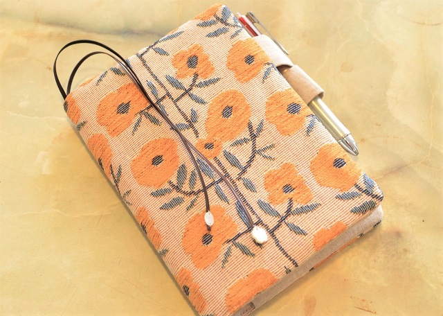 お客さまからのオーダー品です。 つづれ織りフラワーのオレンジで、手帳カバー。 B6サイズの手帳サイズです。 厚手でふっくらしているので、とても丈夫なカバーになりました。 裏地はリネンフラックス 表紙裏に小さなポケットをつけました。 栞は革ひもに貝ボタンを付けて・・ 中の手帳はいろいろ変えてもオリジナルのカバーで楽しめますね! JUGEMテーマ:文...