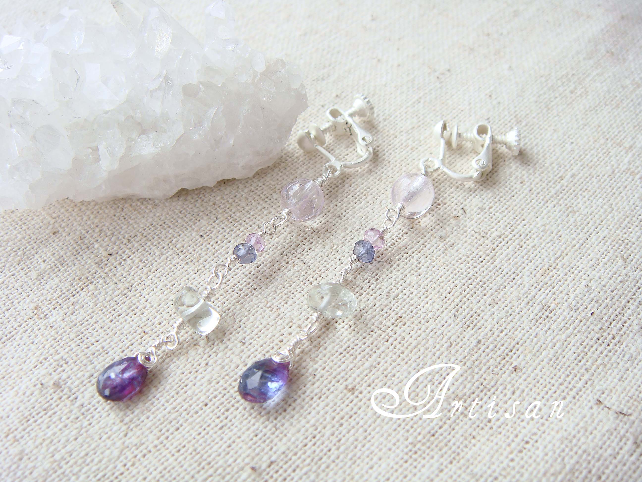 リラの花のイヤリング染めではありますが カットの綺麗なカイヤナイト誕生日石であるクンツァイトとグリーン・ド・アメシストそれに色合せでアイオアライトとピンクアメシストリラの花のイメージで お客様にピッタリなイメージのイヤリングが 出来上がりましたJUGEMテーマ:オリジナルアクセ