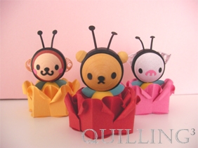 今日はちょっとおもしろい手法が満載の「はるがきた」シリーズについて書こうと思います。 はるがきた 一見小さな着ぐるみはちですが、ちょっとかわったバラの作り方と頭におもしろい手法を用いています。 普通はペーパーをつなげてそれを巻いていくので、あごの部分も例えばこれで言えば黒くなるのですが、これはあごには黒いペーパーはありません。 本当にずきんをかぶっているかのような印象を与えます。 ハチが入っている大きな花が実はバラで、ハチがいない場合はこの中にルーズサークルを入れてみたり、ローズを作って...